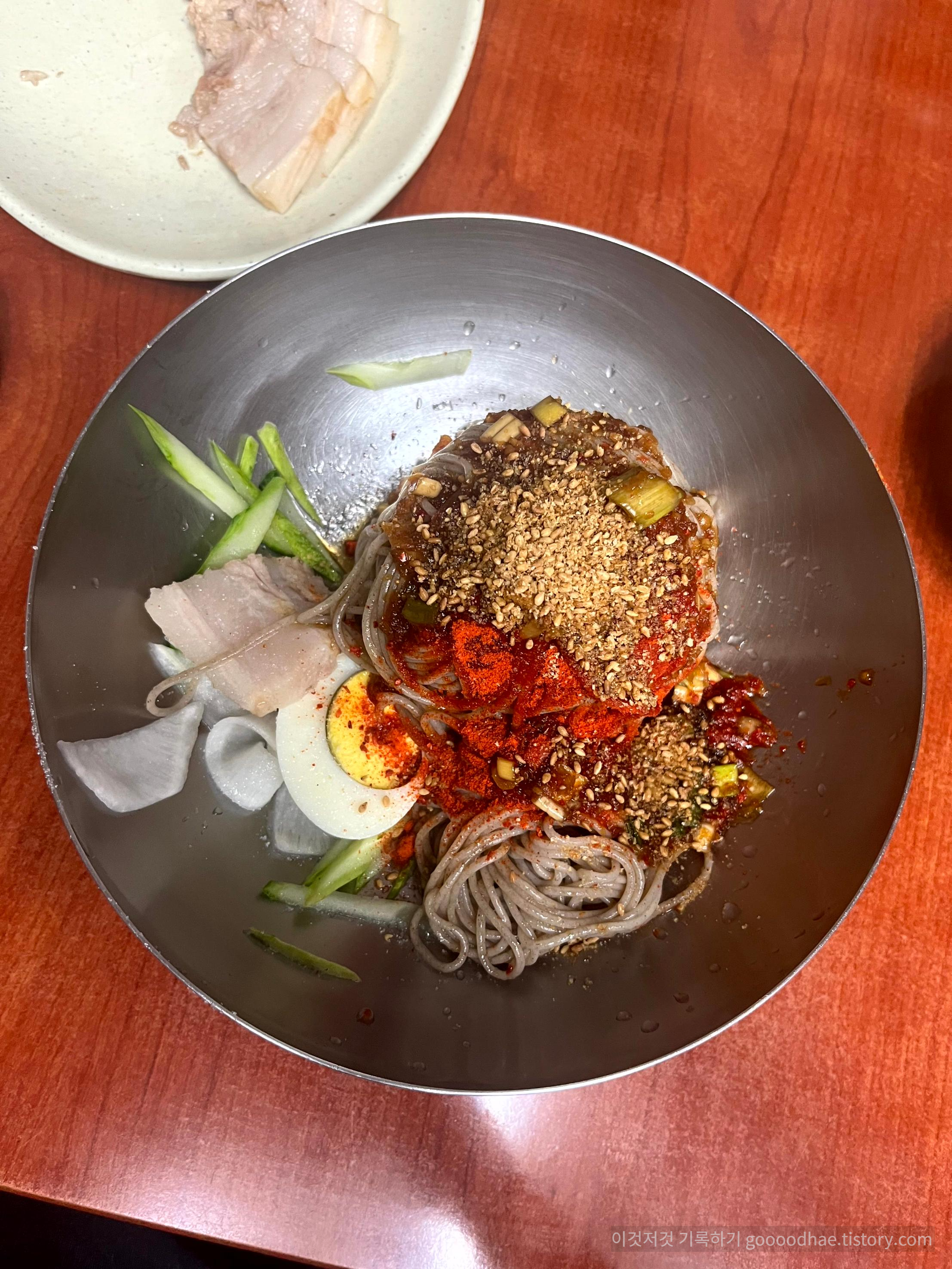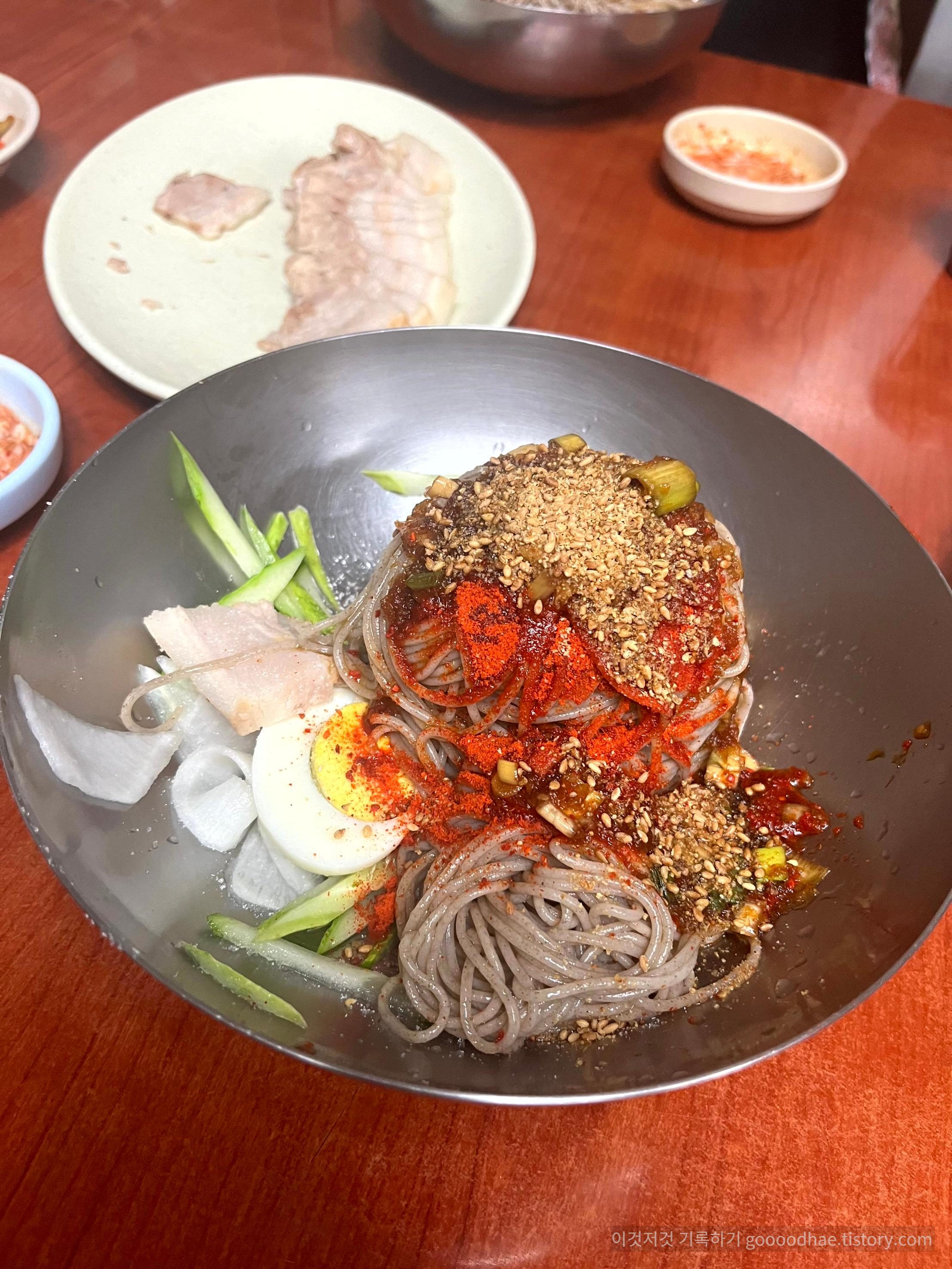 간장소스와 고운 고추가루가 뿌려져서 나오는데 다른 막국수집에서 보기 힘든 생소한 비주얼이다.