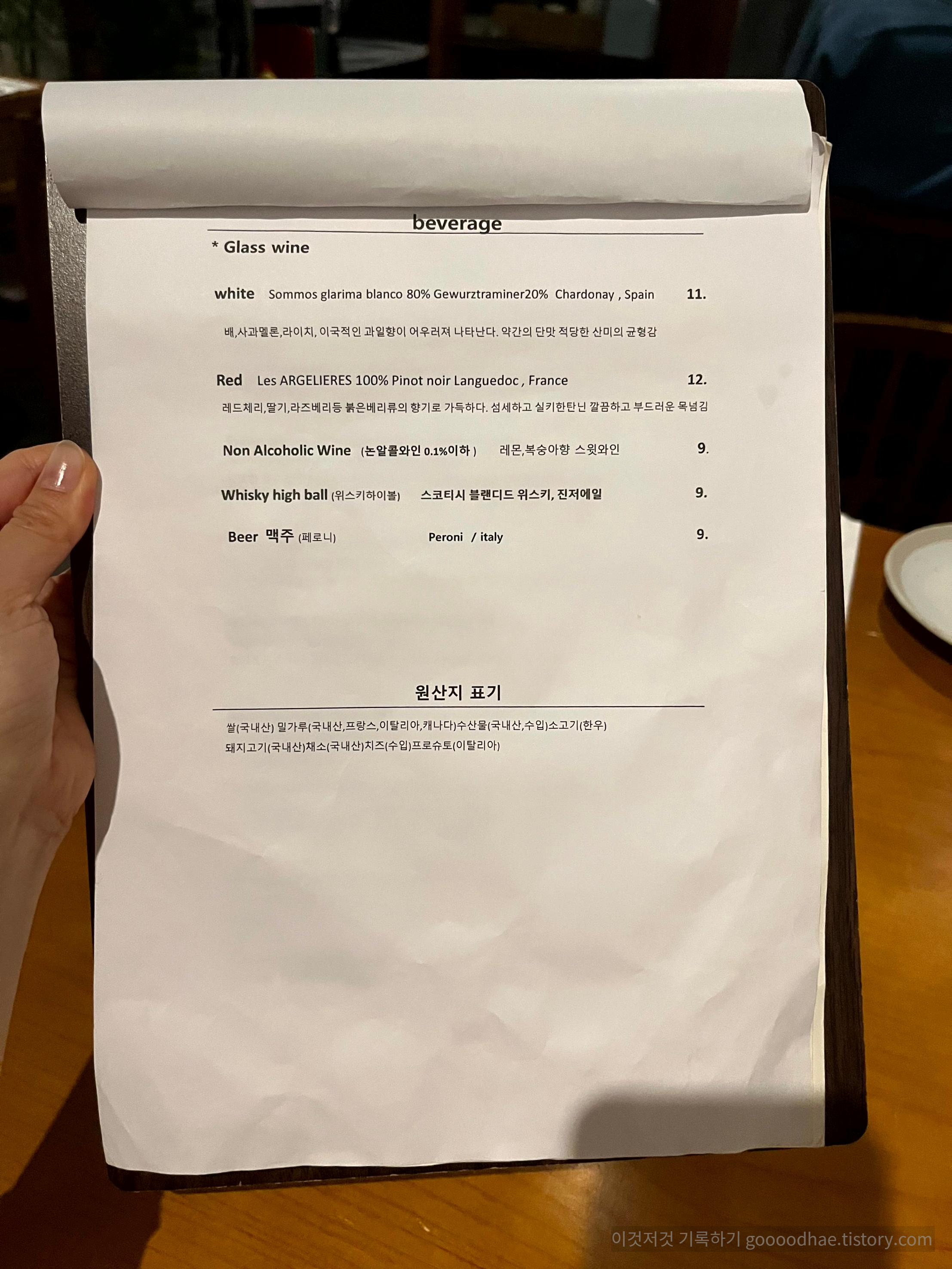 그리고 메뉴들과 페어링하기 좋은 와인들이 몇 가지 있었는데 우리는 셰프님 추천을 받아 이탈리아 와인을 주문했다.